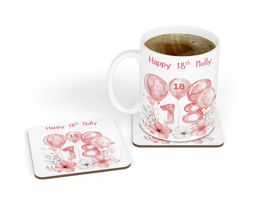 Personalised Mug & Coaster - 18th Birthday Pink Balloons Design