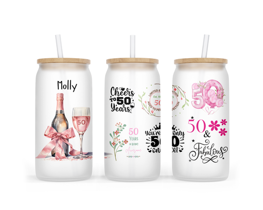 Personalised Frosted Glass Tumbler - 50th Birthday Pink Design