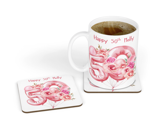 Personalised Mug & Coaster - 50th Birthday Pink Balloons Design