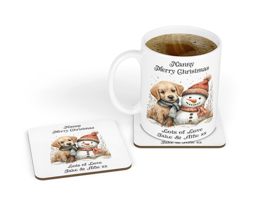 Personalised Mug & Coaster - Christmas Snowman & Puppy Design
