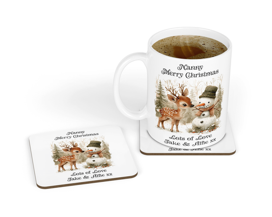 Personalised Mug & Coaster - Christmas Snowman & Deer Design