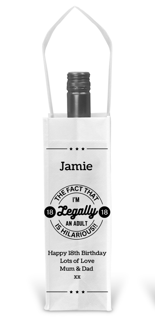 Personalised Bottle Gift Bag - Legally An Adult 18th Birthday Design