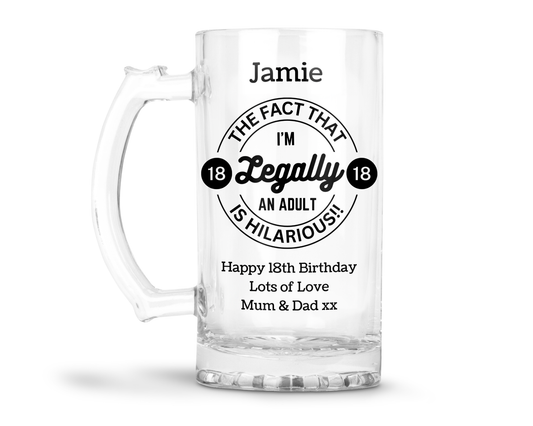 Personalised Clear Glass Tankard (0.8 Pint) - Legally An Adult 18 Design