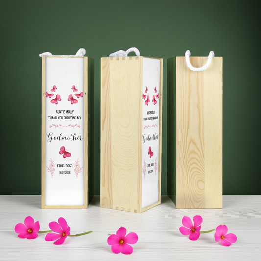 Personalised Wooden Wine Bottle Gift Box - Thank You Godmother Design