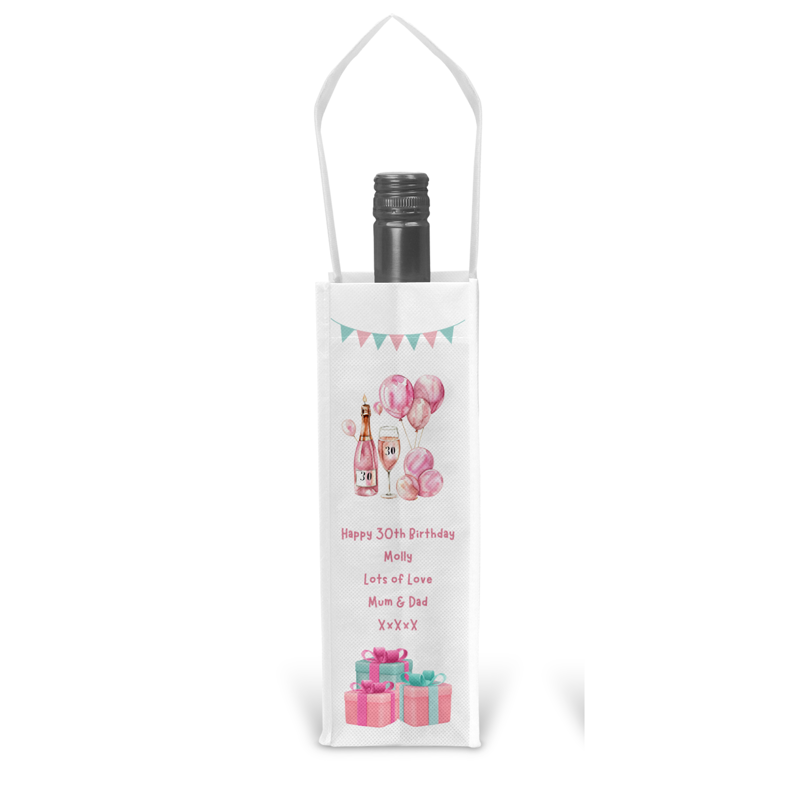 Personalised Bottle Gift Bag - 30th Birthday Pink Balloons Design