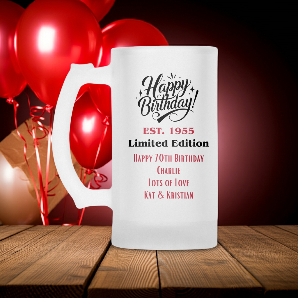 This frosted style glass tankard not only looks like it’s just been pulled from the freezer, but it also features a charming design that reads 'Happy Birthday', 'Est', and 'Limited Edition'.