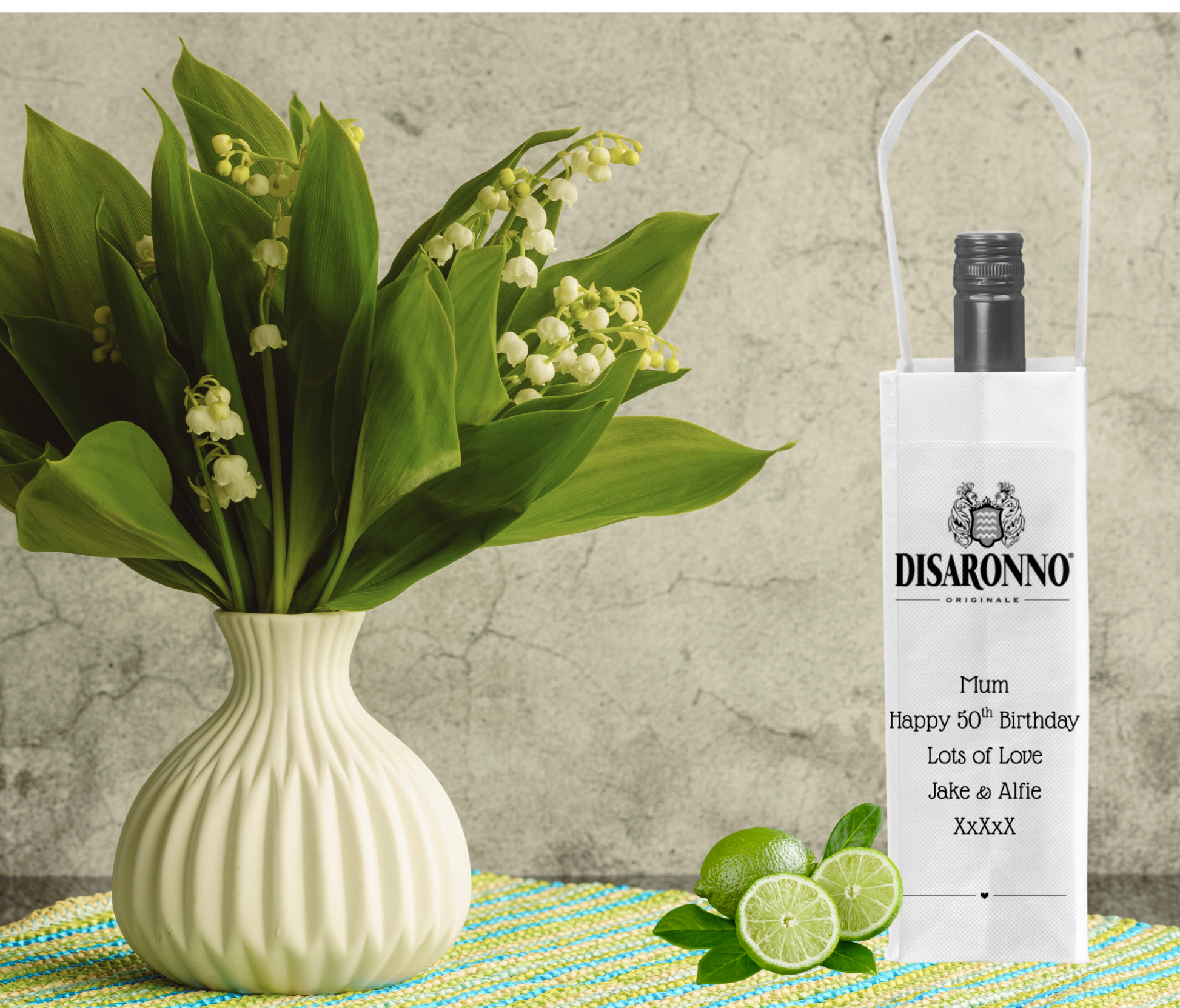 Elevate your gifting game with our stylish White Polyester Bottle Gift Bag, designed specifically to hold a 70cl bottle of Disaronno.
