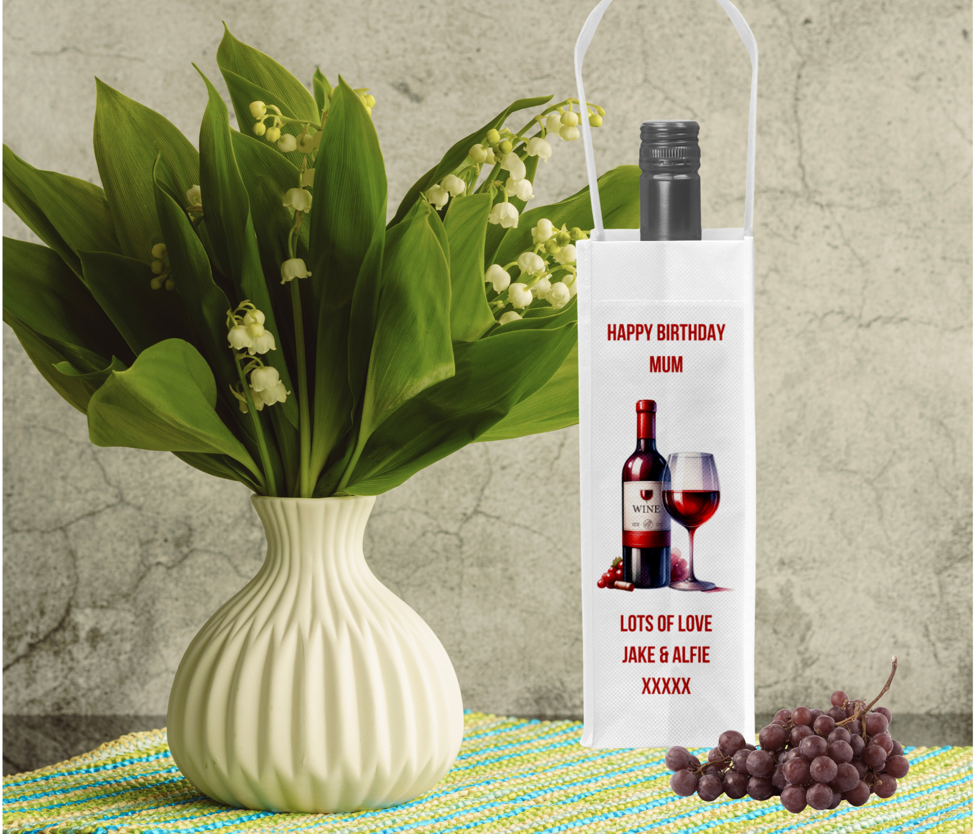 Featuring a charming red wine design, this bag adds a personal touch with a customisable message, making it the perfect gift for wine lovers.