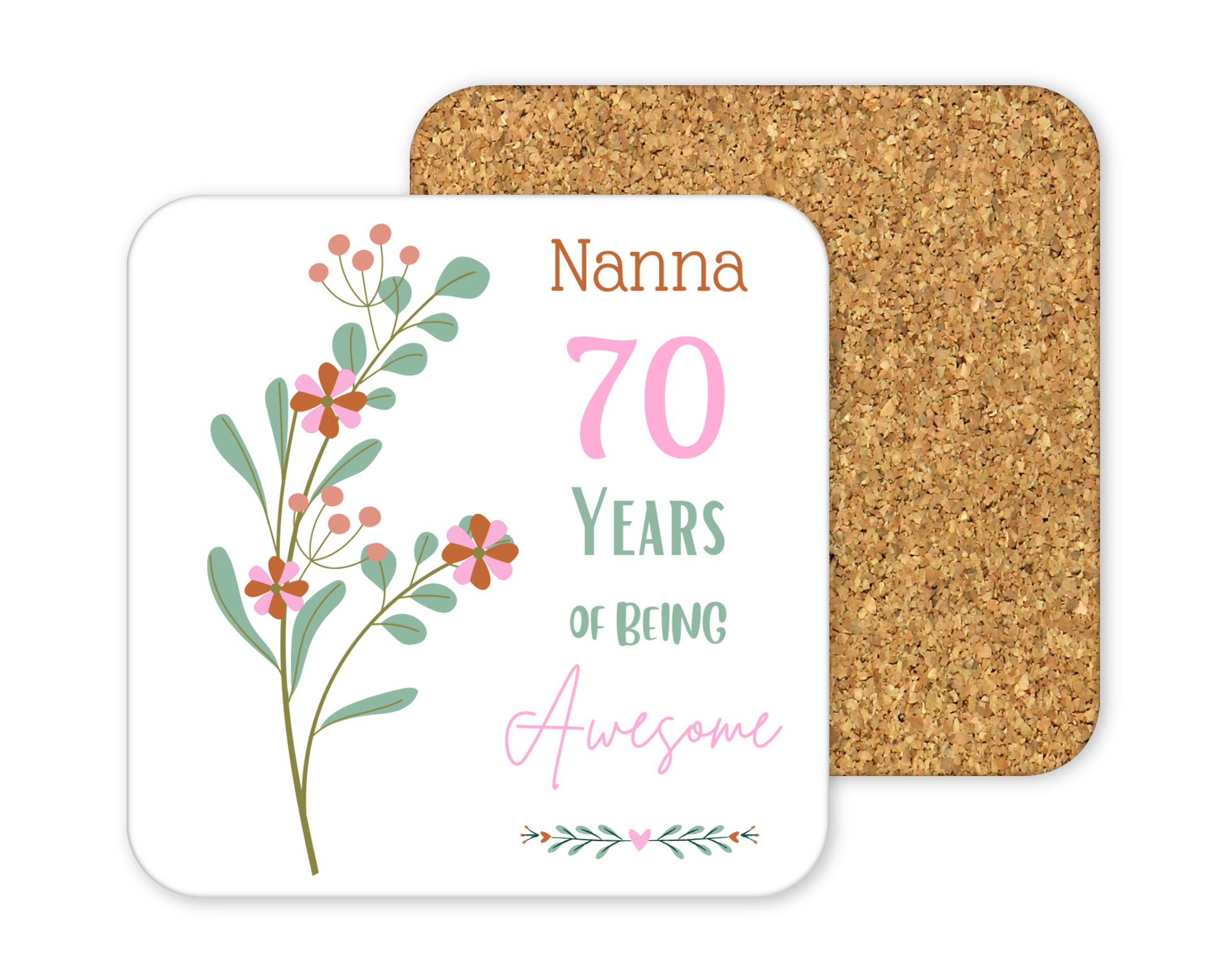 This personalised drinks coaster features a charming floral design and proudly declares "Years Of Being Awesome," making it a perfect tribute to her incredible journey.