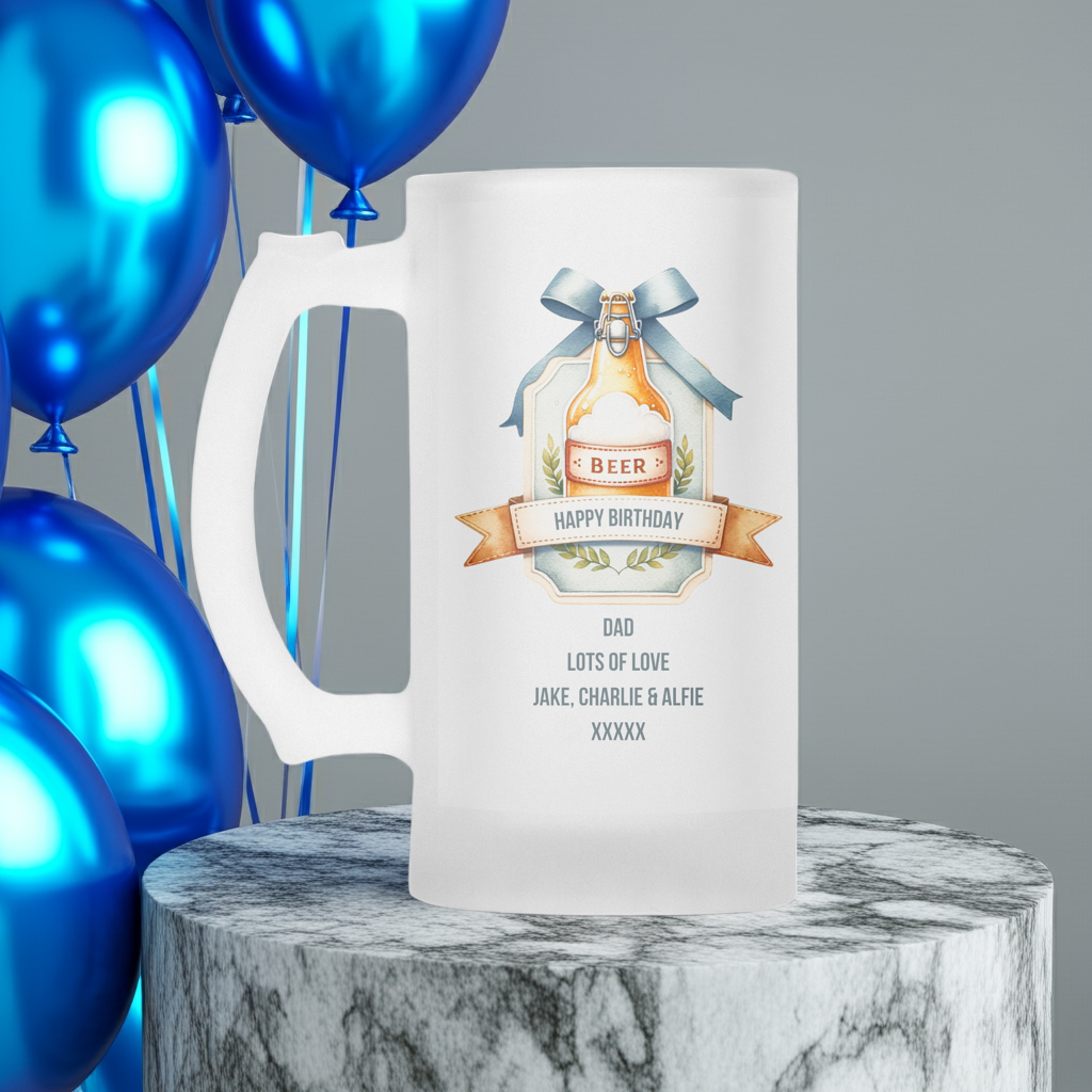 This frosted style glass tankard is not just a drink ware piece; it’s a heartfelt gift for Dad on Father's Day or a unique birthday surprise.