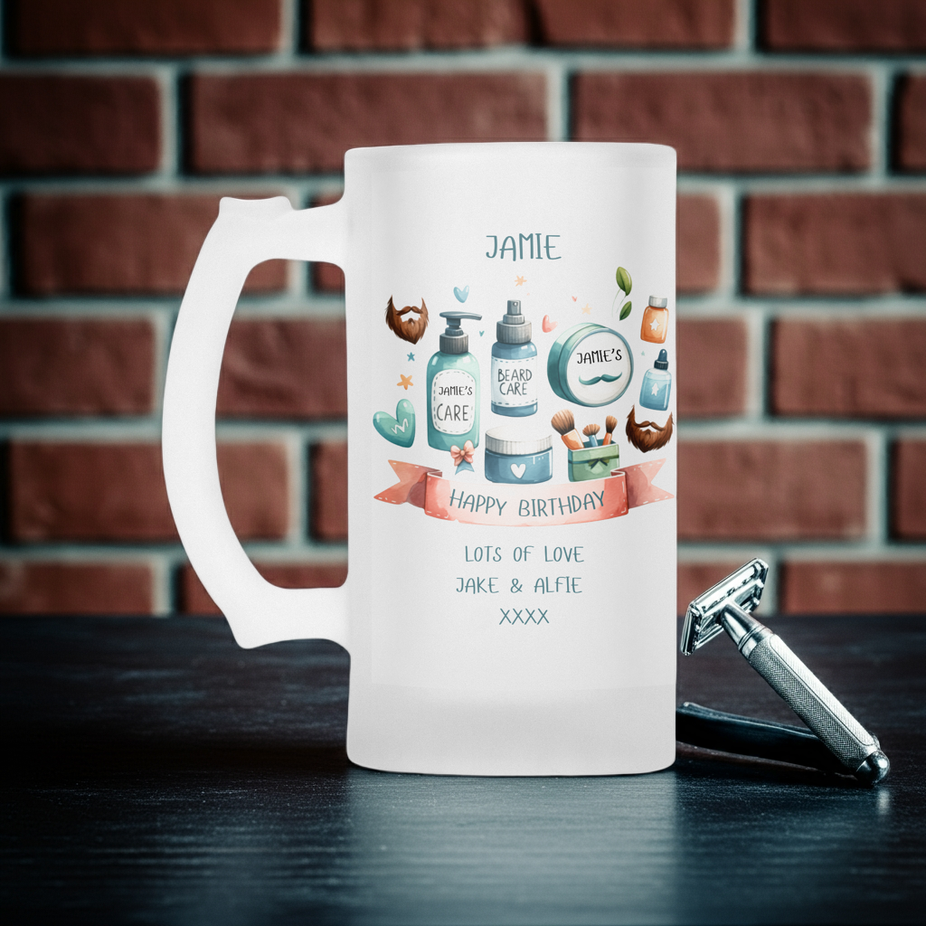 This frosted style glass tankard not only looks like it’s just been pulled from the freezer, but it also features a high-quality printed design that reads 'Care, Beard Care', making it a unique gift for Dad, Son, or any loved one.