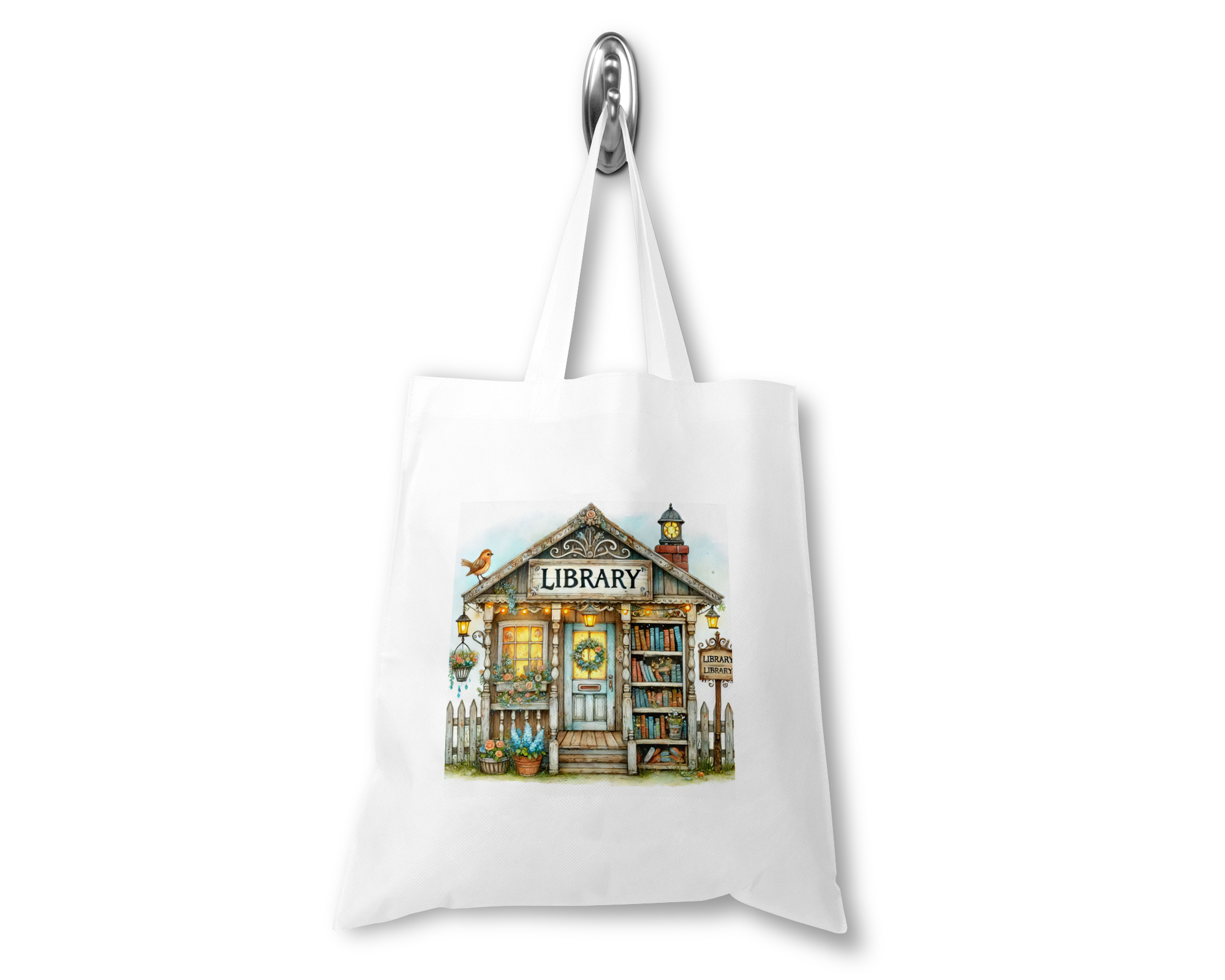 Elevate your everyday style with our Soft Feel White Tote Bag featuring a charming Whimsical Library Design, complete with a delightful house illustration.