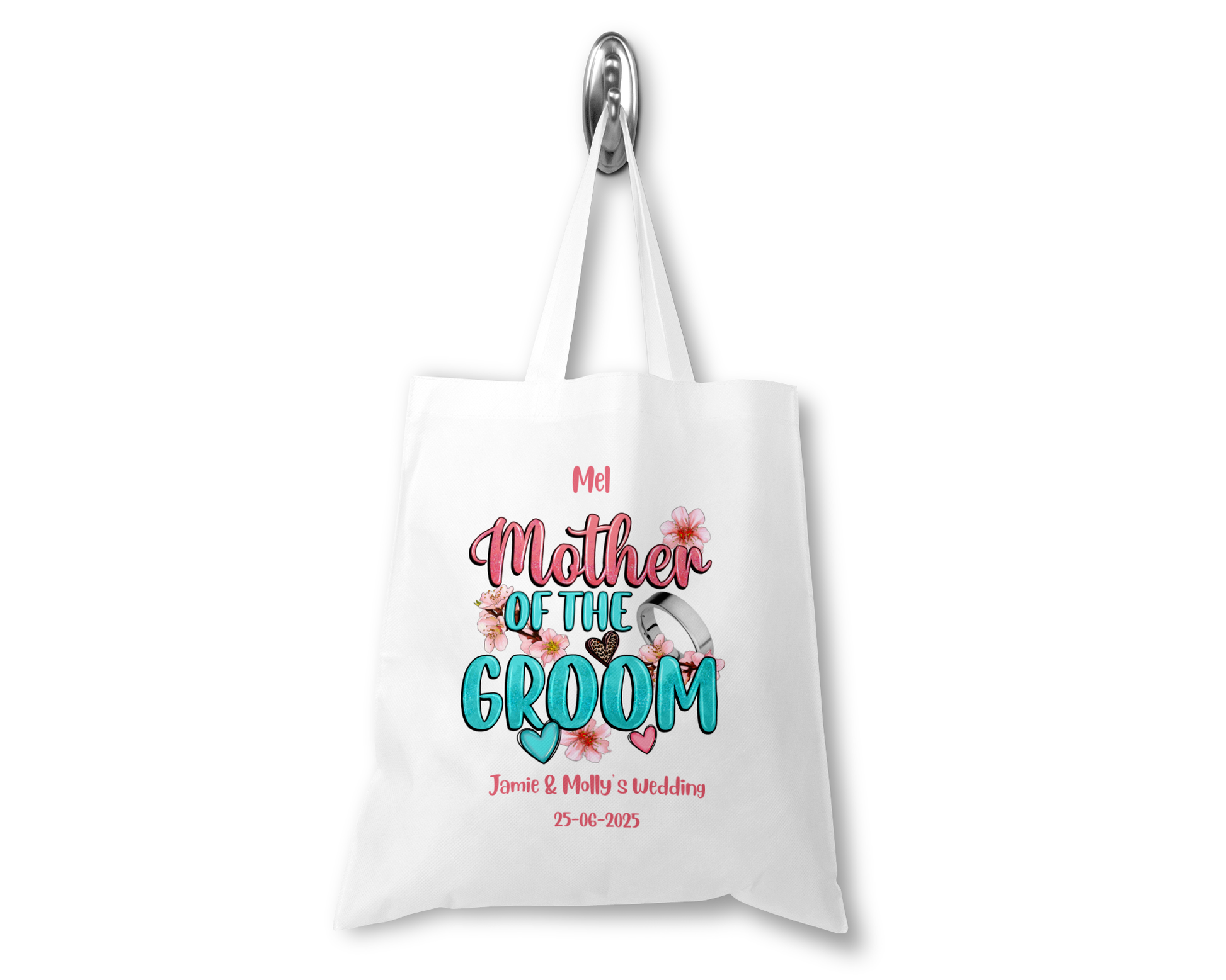 Crafted from soft feel white polyester, this tote features a vibrant design that can be customised with the name of the mother, the bride and groom, and the wedding date, making it a truly unique gift.