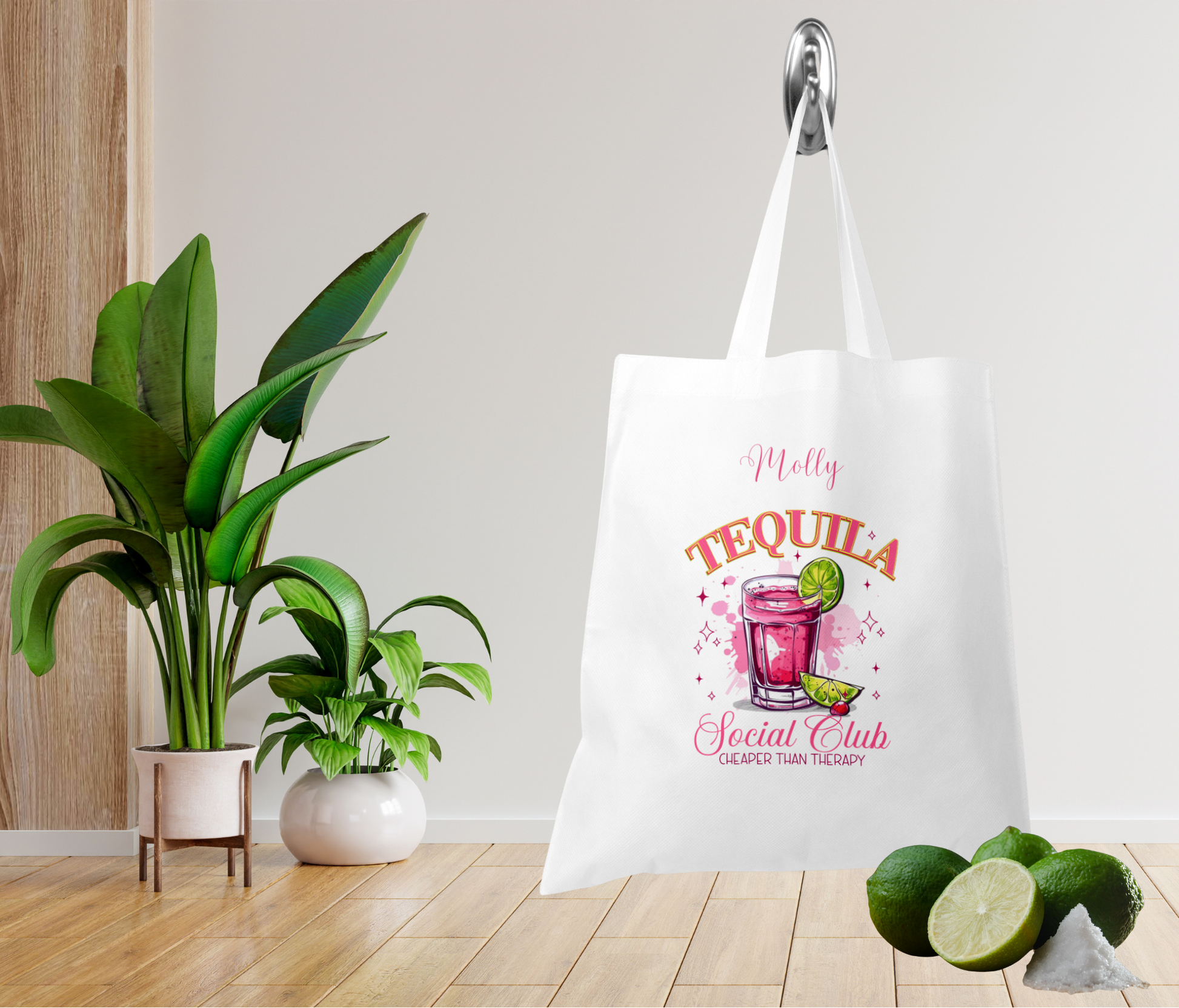 Elevate your casual outings with our charming White Soft Feel Tote Bag, featuring a playful Tequila design that reads 'Tequila, Social Club, Cheaper Than Therapy.'