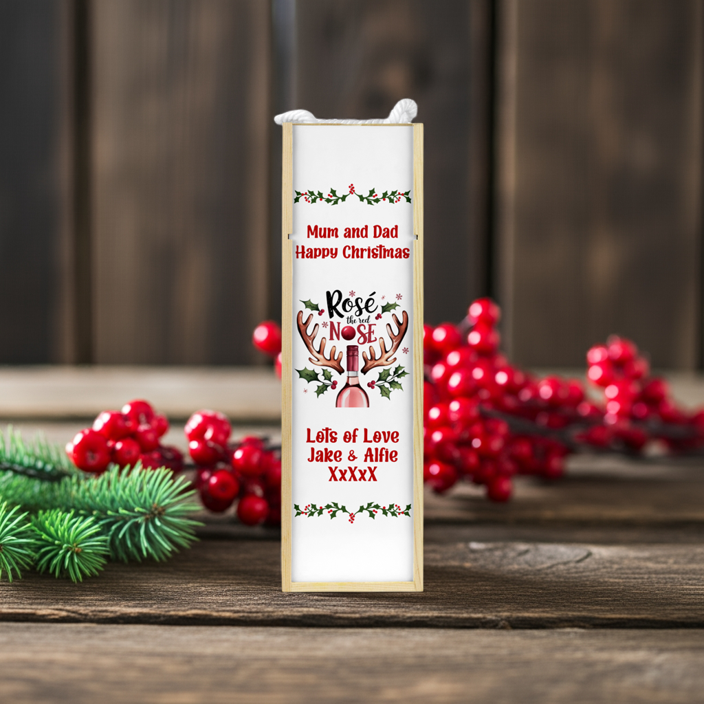 Elevate your gift-giving game with our Personalised Wooden Bottle Gift Box, designed to transform a simple bottle of Rose Wine into a luxurious present for Christmas.