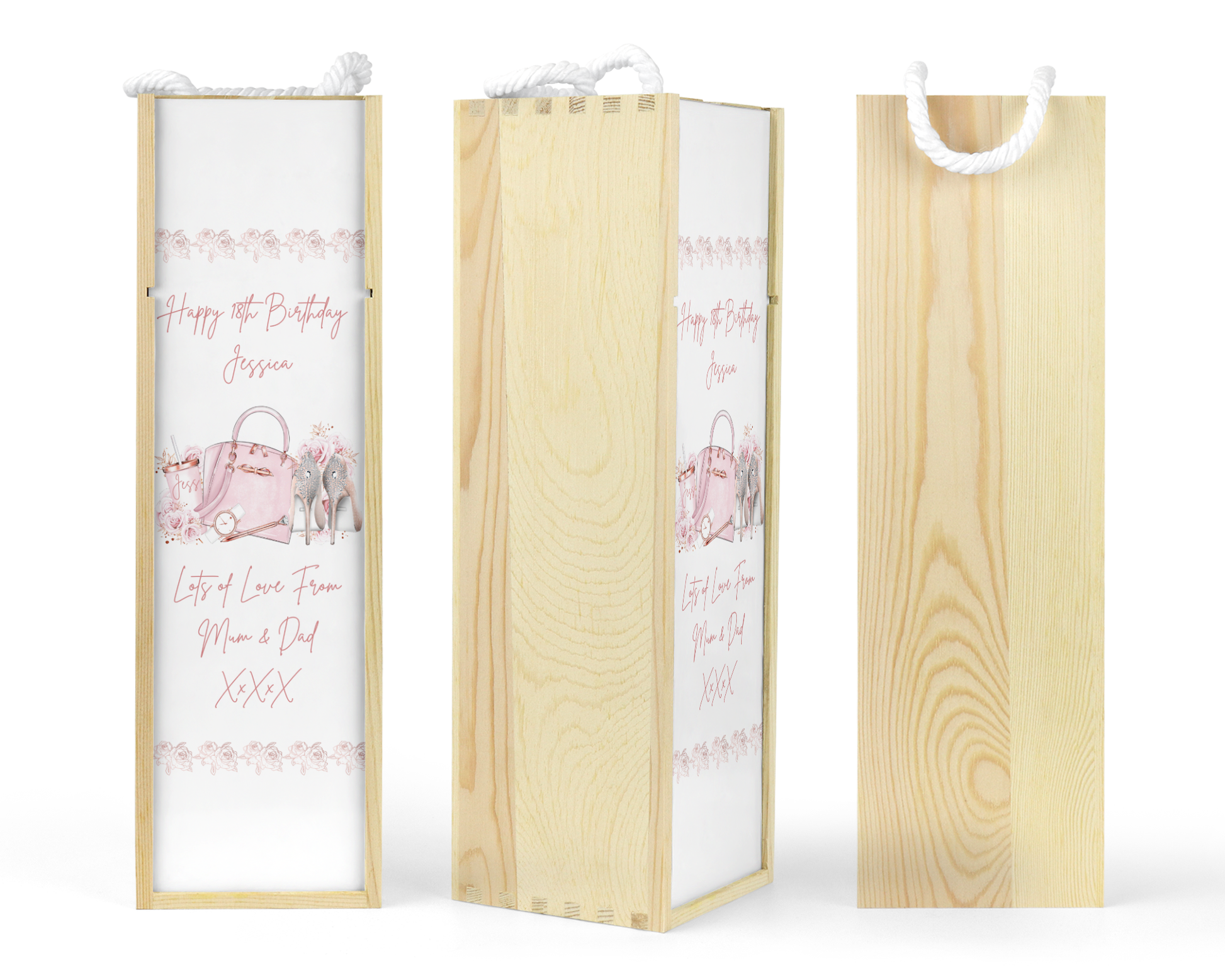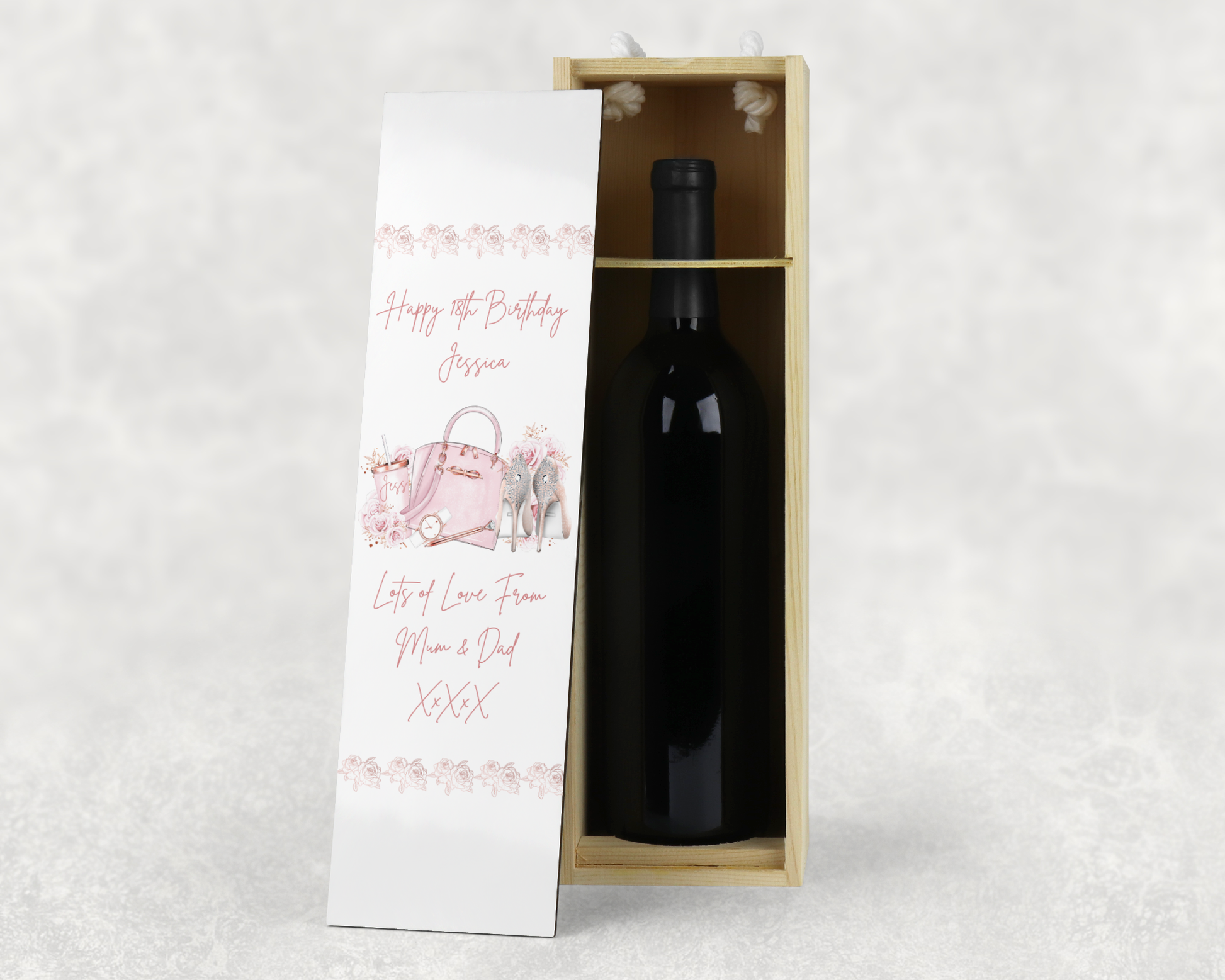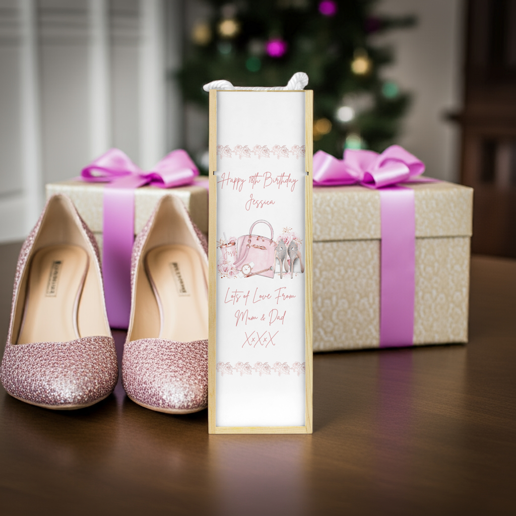 Personalised Wooden Wine Bottle Gift Box - Pink Shoes & Handbag Design